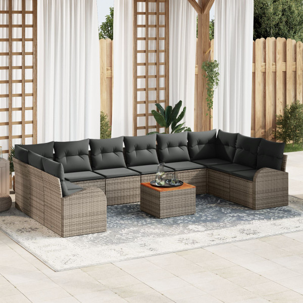 Conjunto de Sofá de Jardim com 11 peças. almofadas cinzas. rattan sintético e madeira de acácia.