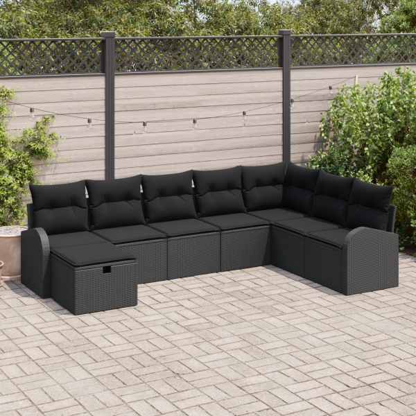Conjunto de Sofá de Jardim de 8 Peças com Almofadas Preto Vime de Poliéster