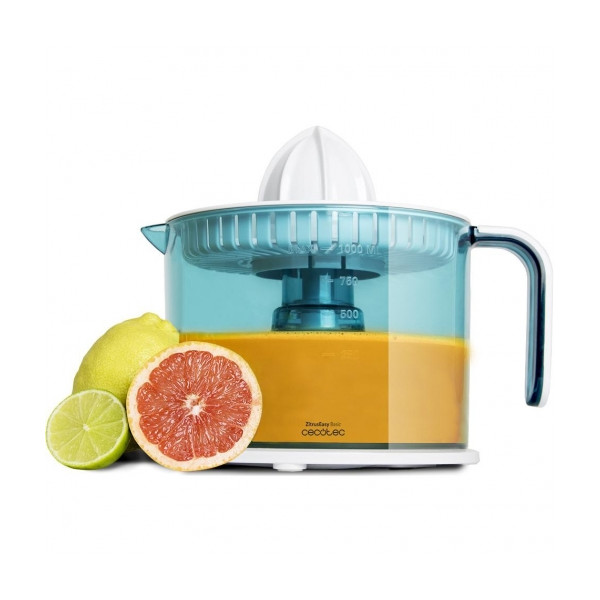 Exprimidor eléctrico para naranjas y cÃtricos con 40 W de potencia.Dosconos desmontables, para cÃtricos más pequeños o más grandes.Doblesentido de giro para aprovechar al máximo la fruta.Encendido automáticocon solo presionar el cono con la fruta.Tambor BPA-free, calibrado en mlcon capacidad de 1 l.Boquilla con sistema antigoteo para un vertido másfácil y limpio.Incluye cubierta antipolvo para protegerlo al guardarlo.Huecorecogecables y base antideslizante.Desmontable para facilitar lalimpieza.Piezas no eléctricas aptas para el lavavajillas.CARACTERISTICAS Almacenamiento de cable Si Color del producto Transparente, Turquesa, Blanco Contenedor de jugo Si Contenedor de zumo 1 L Partes de platos a prueba de agua Si Tipo de producto Exprimidor eléctrico con brazo