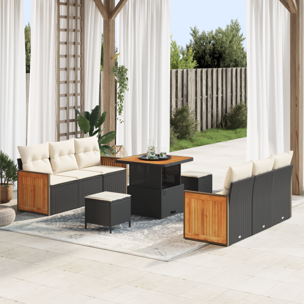 Conjunto de Sofá de Jardim 9 Peças com Almofadas Rattan Preto Acácia