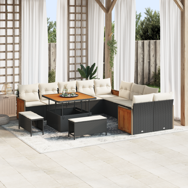 Conjunto de Sofá de Jardim de 13 Peças com Almofadas Preto Vime Poliéster Acácia