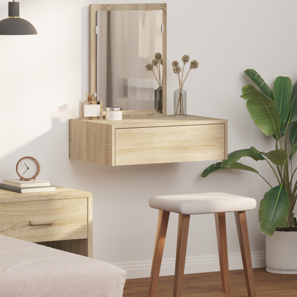 Esta bancada de maquiagem suspensa combina looks modernos com praticidade, tornando-se ideal para qualquer quarto ou área de grooming. Com um acabamento texturizado de carvalho Sonoma e linhas limpas, é não só estilosa, mas também muito funcional para o dia-a-dia. O design suspenso economiza espaço no chão, mantendo tudo organizado e permitindo fácil acesso aos itens de vaidade. Uma gaveta tradicional generosa está incluída, garantindo que os cosméticos e acessórios permaneçam arrumados e de fácil acesso. O espelho plano melhora a experiência de grooming, refletindo a luz natural para criar uma atmosfera acolhedora. Feita de madeira engenheirada de qualidade com partes da gaveta em carvalho sólido, esta bancada é uma peça bonita e resistente, mantendo o charme ao longo do tempo. Medindo 60 cm de comprimento, 40 cm de largura e 70 cm de altura, tem o tamanho e a funcionalidade ideais, adaptando-se a diferentes estilos de quarto. Ler menos
